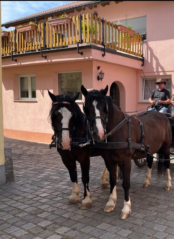 Auf unseren Hof leben derzeit unsere Familie, zwei Kutschpferde, verschiedene Vögel, die Deutsche Pinscher-Gang und unser etwas betagte Rottweiler.