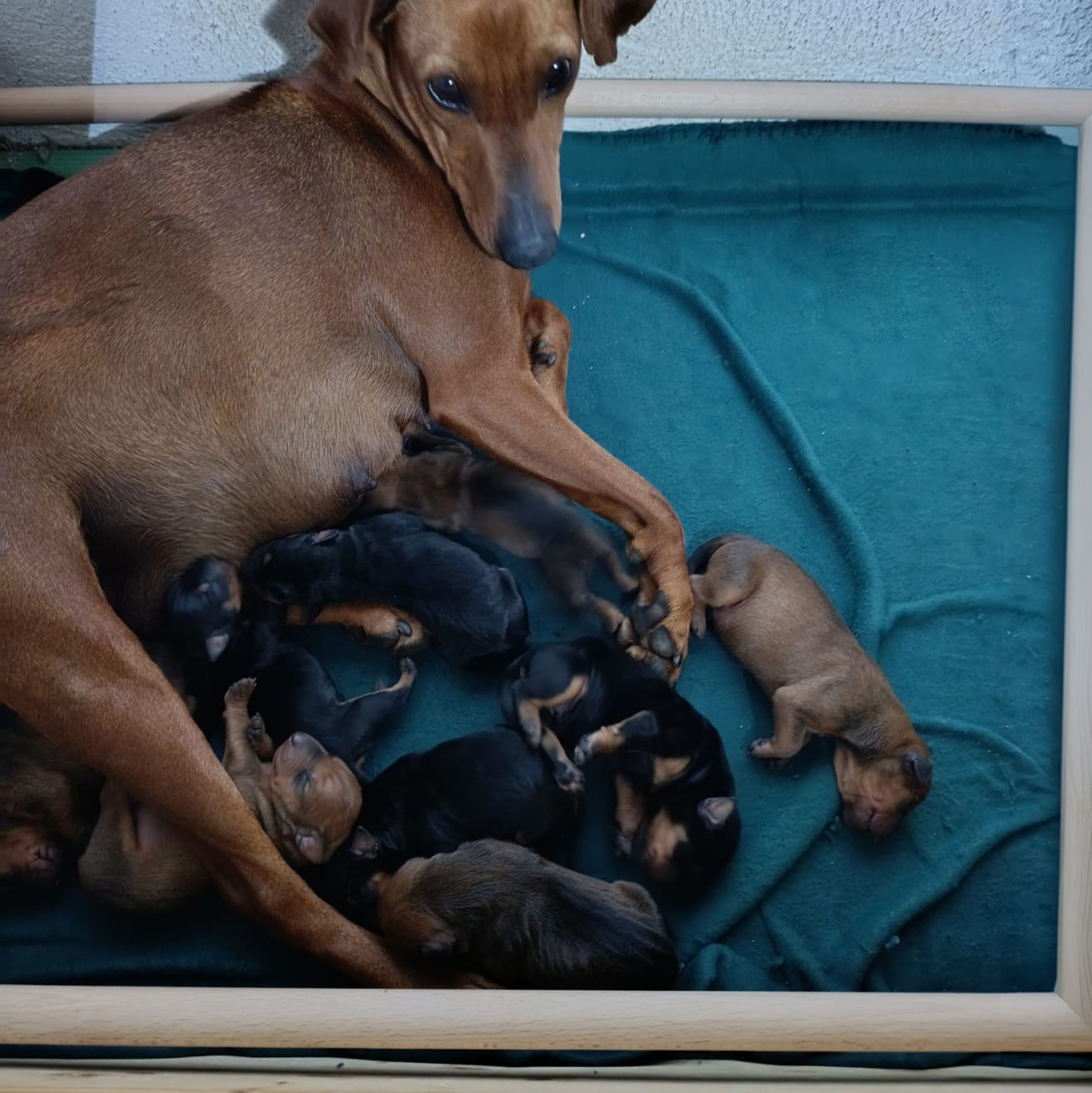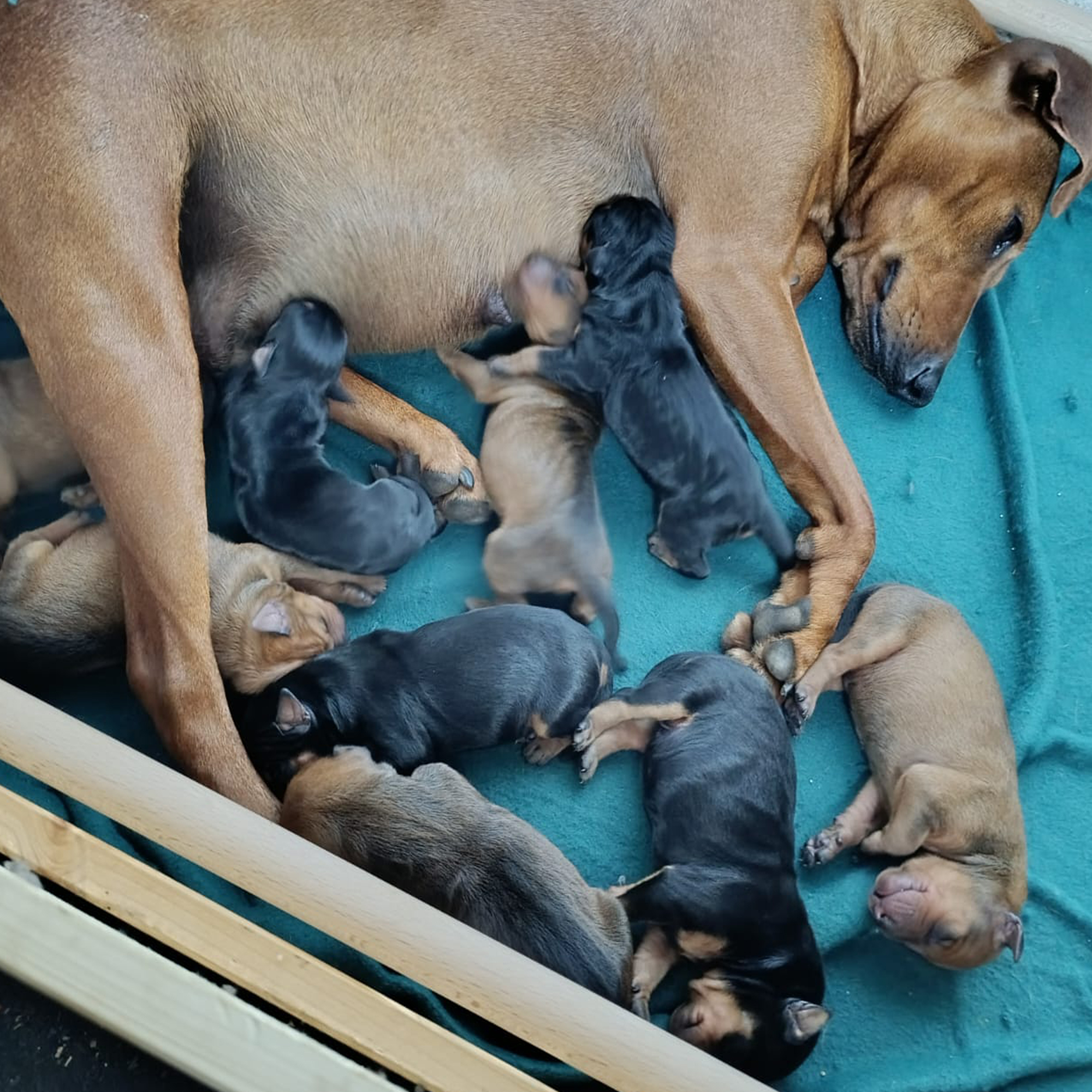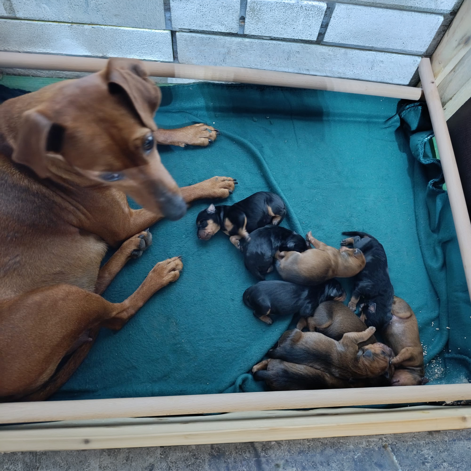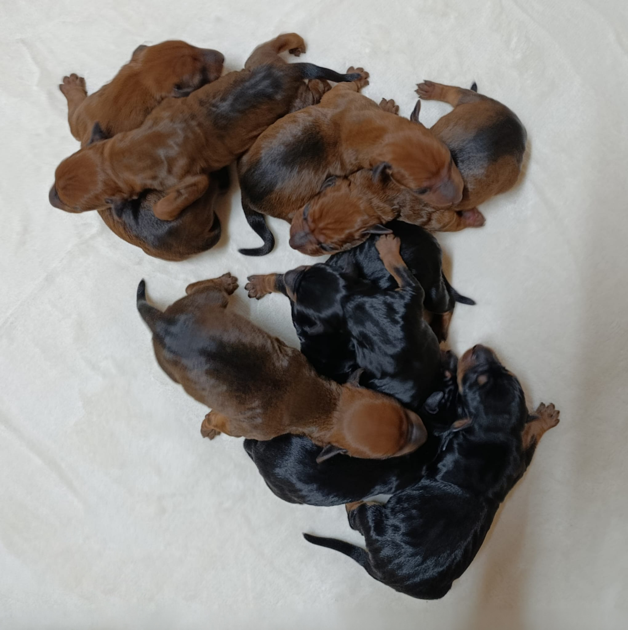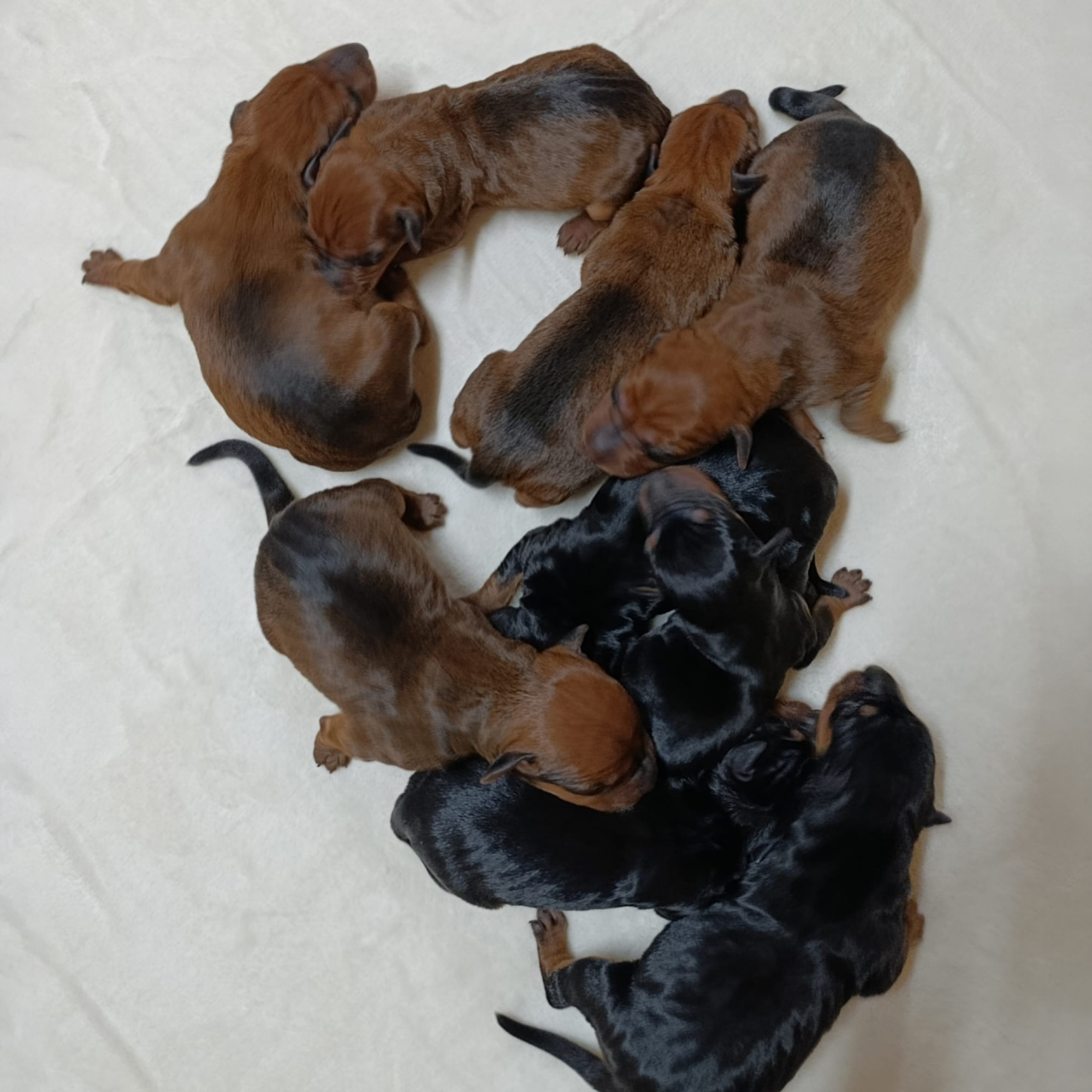 Es sind 9 Welpen in schwarz-rot und rot gefallen. Es sind 5 Hündinnen und 4 Rüden und alle sind gesund und munter. 😍